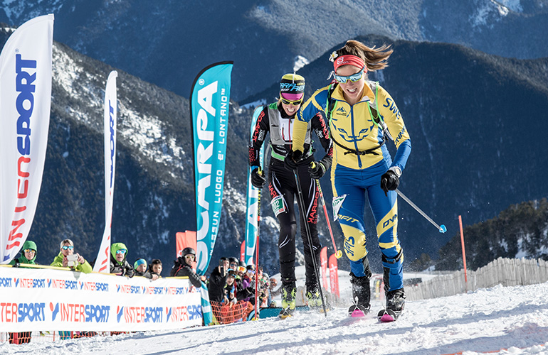 Emelie Forsberg pushing hard in the Andorra vertical skimo race. © ISMF Press Office
